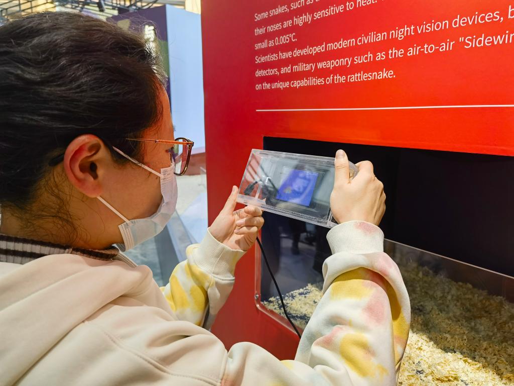 6岁的小游客萌萌透过红外互动装置,看到箱子里的两只小仓鼠化作蓝色背景中移动的亮红色色块,兴奋地说:“原来蛇是这样‘看待’猎物的!真是太有趣了!”萌萌在展区里流连忘返,久久不愿离去。